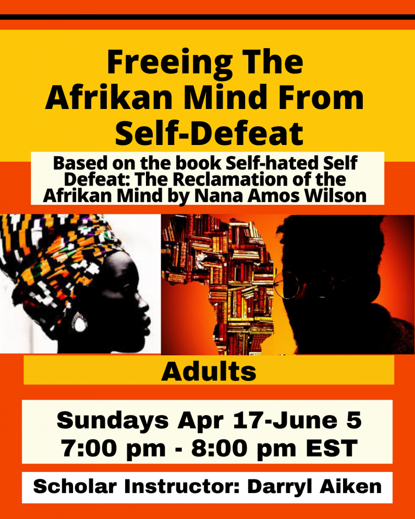 This course is a deep look into the ways that our minds have been colonized through Yurugu (European) culture. And even more, how each and every one of us can begin to dissect our thought processes and habits that do not serve our highest good as Afrikan people. In this course, you will learn ways to decolonize your mind and begin to strategically empower ourselves, our families, and our people. We will use the scholarly works of Nana Amos Wilson, The Falsification of Afrikan Consciousness, as well as videos, discussions, etc.